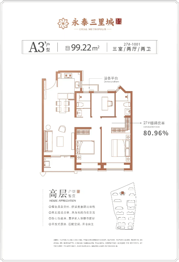 社区规划,是决定一个项目成功与否的所在。永泰三里城从拿地开始,就做出了之为“改善”而造的规划。根据项目规划设计的具体方案,能提取出两个关键信息,一个是产品面积段集中在建约99-151㎡,一个是社区容积率2.0。
