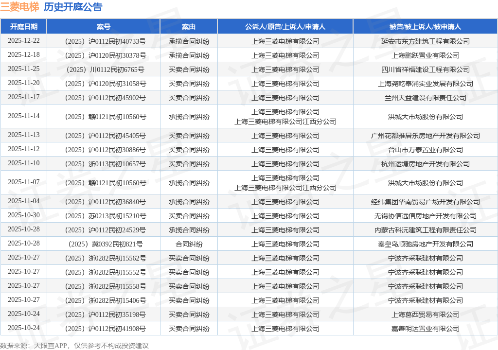 依据计算,近一年内以上海三菱电梯有限公司为当事人的前史开庭公告有424则,其间案由为“生意合同纠纷”的公告以269则居首,其次为“承包合同纠纷”有64则,“合同纠纷”有16则。前史开庭公告(前20条)如下: